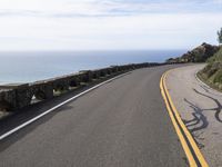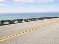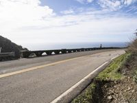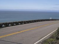 The Big Sur stretch of the Pacific Coast Highway in California, USA, offers a scenic view of the ocean from a low, elevated highway. A clear day reveals the road surface with its lanes, guard rails, and Armco barriers, as well as the infrastructure of the fixed link along the coastline. Nature meets modern transport in this beautiful landscape.
