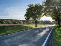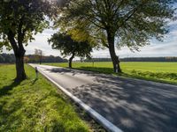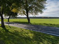 A cyclist wearing a helmet and bicycle clothing rides down a rural road in the countryside of Berlin, Germany. The cloud-filled sky and lush vegetation of the field and trees provide a beautiful backdrop to the winding road.