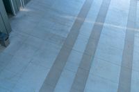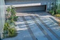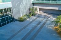 A top-down view of an office building in Los Angeles, California, USA, casts a hard shadow on the concrete surface below. The elevated position of the camera gives an aerial view of the one-quarter profile of the urban design, the modern architecture, and the open space.