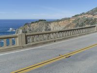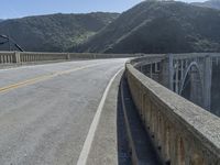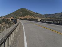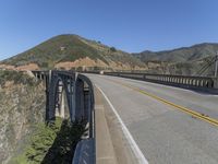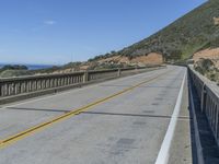 A view of the Bixby Creek Bridge in Big Sur, California, USA. This concrete bridge is part of the Pacific Coast Highway and is a fixed link with a high curve along the coastal mountain landscape. The bridge is surrounded by a clear blue sky with a mountain range in the background and a yellow Armco barrier along the road surface. The sea and the cliff terrain are visible in the distance in the sunny day.