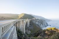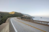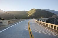 A scenic view of Bixby Creek Bridge at dawn, with a straight road leading towards the coastal landscape and clear sky in Big Sur, California, United States.