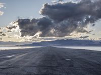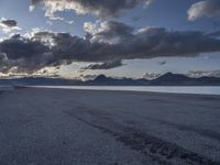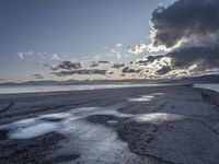 The unique landscape of Bonneville Speedway in Salt Lake City, Utah, USA, is highlighted by its beautiful blue horizon at dawn, with a calm atmosphere of the desert, mountains, and water resources in the distance. The reflections of the clouds, sun, and trees add to the dramatic natural environment of this winter day.