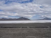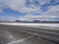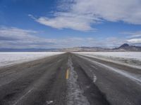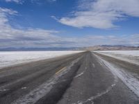 A view of the Bonneville Speedway in Salt Lake City, Utah, USA. The asphalt road stretches out in a straight line towards the horizon, surrounded by the salt lake, desert, mountain landforms, and natural environment.