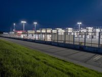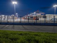 the view from a walkway over a parking lot on a night time, looking at a port container terminal