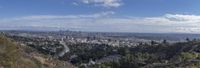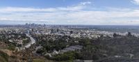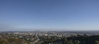 Aerial view of the Los Angeles skyline at dawn, California, USA. The metropolitan area is full of modern architecture, urban design, and skyscrapers, with the horizon lit up with a clear sky and the mountain and trees of the coastal areas in the background.