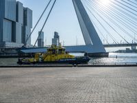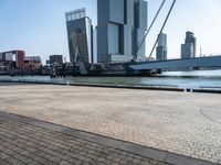 The sun rises over the horizon in Holland, casting a glow over the cityscape of modern architecture, cobble stone roads, and high-rise buildings. Water from the lake reflects the urban design of the European country, with sailboats, bridges, and cable-stayed bridge profiles visible in the clear sky. A mode of transport in the form of a vehicle, boat, or mast can be seen in the monochrome coastal city, with sunshine illuminating the urban neighborhood, thoroughfare, and infrastructure of asphalt, wood, tar, and tree surfaces.