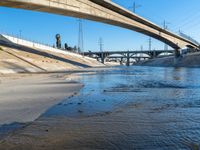 The morning light casts a hard shadow on a bridge and its underpass in Los Angeles, California, USA. The wet road and river provide a picturesque backdrop to the residential suburban area.