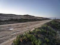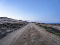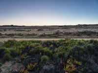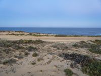 At the break of day, the azure ocean and lush vegetation of Portugal's coastal landscape are illuminated by the morning sun. The sandy beach and grassy terrain stretch out in the distance, leading up to the rocky headlands and mountain landforms on the horizon.