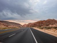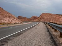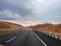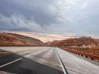 The low sun casts a dramatic light on the grass, trees, and tar-covered road which winds through a Californian valley of farmland and mountain landforms. A grey sky looms overhead, contrasting the browns and greens of the natural environment below.