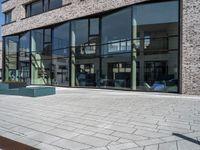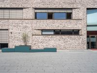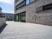 A modern building with a brick facade and wood window frames stands tall in the foreground, with asphalt roads, paver curb, and a brick wall in the background. The clear blue sky brings out the hard shadows cast by the building, creating a composite material of urban design and modern architecture in this residential neighborhood of Bremen, Germany.
