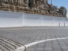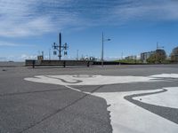 A view of the Bremerhafen pier, jetty, landing, and plaza on a sunny day in Bremen, Germany. The city's infrastructure is visible with asphalt roads, zebra crossings, street lights, and public utilities. The clear sky and horizon provide a backdrop to the urban design and architecture, while trees and curbs line the thoroughfare.