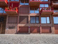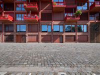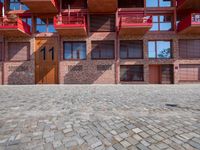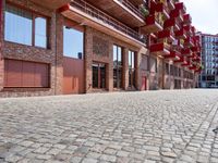 A red brick wall stands in the business district of Berlin, Germany, against a backdrop of modern architecture and cobble stone roads in this urban European city. Home to museums, hotels, and residential houses, this art district provides a unique surface to explore.