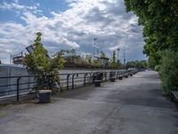 Berlin's urban design is brought to life along the river and canal, where city life thrives under the European sky. Concrete structures cast hard shadows on the water's surface, creating a picturesque profile of the city. Jetty and piers line the riverbank, offering a landing spot for urban explorers to soak in the beauty of the city. Clouds drift overhead, adding a dynamic element to Berlin's urban landscape.