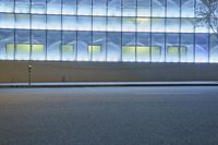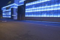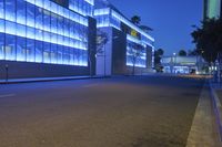 A low angle snapshot of a busy office building and its surrounding infrastructure in Los Angeles, California, USA. The modern architecture and artificial light of the metropolitan area, night time streets and neon lights, and vegetation and trees of the public space create a diverse and vibrant cityscape.