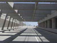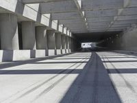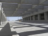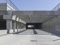A monochromatic view of the Brutalist architecture of Los Angeles, USA, featuring a concrete and glass bridge, metal beams, a chain link fence, and a leafy tree in the foreground.