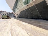 A view of a modern apartment building in the city of Porto, Portugal, showcasing brutalist architecture with concrete, glass, metal and wood materials and a concrete bridge in the background. The clear sky reveals a cityscape with tourist attractions and corporate headquarters, surrounded by a highway entrance and exit ramp.