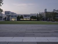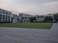 A modern business district in Shenzhen, Guangdong, China, with a combination of urban infrastructure, office buildings, residential areas, open spaces, and parking lots. The clear sky creates a beautiful backdrop of the concrete and asphalt surfaces, trees, and grass lawns on this sunny day.