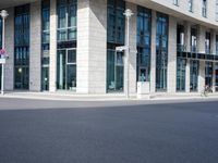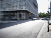 A fast-paced downtown neighborhood in Berlin, Germany with mixed use of modern architecture, public space, residential areas, and corporate headquarters. Automobiles, bicycles, and other land vehicles drive down the lane lined with glass buildings, condominiums, and houses, creating motion blur and shadows on the asphalt road surface.