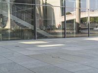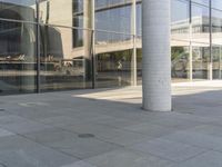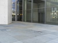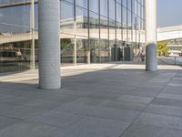 A modern office building in Berlin, Germany, featuring composite material, wood flooring, glass walls, and a variety of tints and shades. The building stands among a number of urban design elements, such as roads, curbs, gas fixtures, and public spaces, and is surrounded by a neighborhood of vegetation, houses, restaurants, and cafes. The symmetry of the facade is highlighted by the day's light.