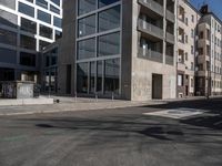 A stunning view of modern architecture in the financial district of Berlin, Germany, with cobblestone roads, grey asphalt, and tall buildings in the backdrop of a clear sky. Cafes, condominiums, driveways, doorways, facades, fixtures, flooring, glass, halls, high-rises, houses, offices, open spaces, properties, public spaces, rectangulars, residential areas, roads, surfaces, trees, urban design, vegetation, walls, and windows come together to form the metropolitan area.