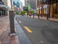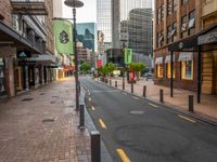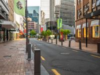 A bustling city street with modern architecture and urban design, filled with shops, cafes, and office buildings. The road is made of asphalt and is lined with storefronts. Traffic lights and stoplights regulate the flow of traffic in this vibrant city.