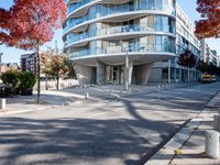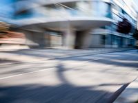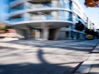 A busy street in the HafenCity district of Hamburg, Germany, provides a glimpse of modern European architecture and the motion of a passing vehicle on a sunny day.
