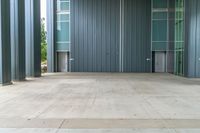 An open office building in the modern urban design of the business district of Los Angeles, California, USA. Concrete surfaces and straight roads lead the eye into the city on a bright day.