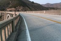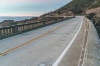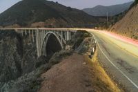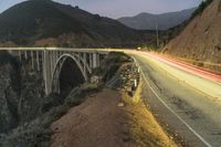 The sun rises over the Big Sur coastline in California, USA, illuminating the ocean, mountains, and infrastructure of the Pacific Coast Highway. The coastal landscape is visible from the asphalt road, with its S-curve, guard rail, and fixed link bridge. Automobiles, trees, hills, and tracks are seen in the distance, against a clear sky and dramatic horizon.