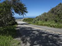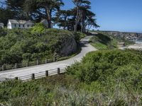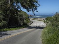 Scenic view of California's coastal landscape with mountains in the distance and a winding road alongside the water. The lush green grass and palm trees add to the natural beauty of the area.