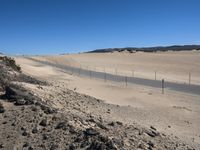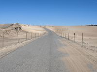 Scenic view of a low coastal road in California, USA, with asphalt surface winding through a stunning landscape of sand dunes, desert, and ocean. The clear sky and straight road create a captivating horizon and profile against the elevated surface. The foreground showcases the natural environment and singing sand, while mountains loom in the distance.
