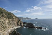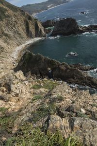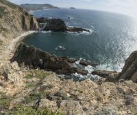 A scenic view of the coastline of California, USA. The rugged terrain of the headland, sea, shore, and cliffs can be seen in the foreground, with a lake, bay, Cape, and ocean in the background. Far in the horizon, contrails of a plane can be seen in the bright blue sky.