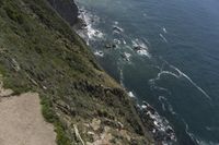 A view of the USA coastline in California, showing the open terrain and the shoreline of the ocean, with cliffs, headlands, and rocks protruding from the sea.