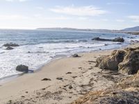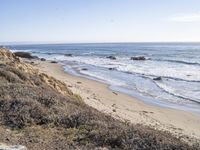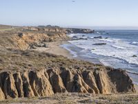 A winding road surrounded by nature takes travelers through a coastal paradise of Montaña de Oro State Park in California, USA. The panoramic view from an elevated perspective highlights the natural environment of the park, from the rocky headlands and bluffs to the sandy beach and grassy highland.