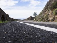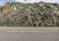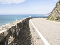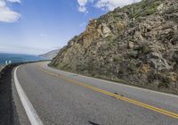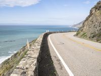 A view of the California Coastline on a sunny day, showing the Big Sur's Pacific Coast Highway, the elevated highway, and the Armco Barrier on the shoreline. The coastal landscape features a variety of terrain, including water, grass, trees, rock walls, outcrops, and fault lines, as well as a clear sky.