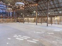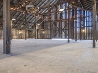 An inviting country barn in California showcasing a rustic interior design with wood flooring, beam ceiling, and abundant natural light. The spacious open space and elevated profile offer a charming atmosphere, perfect for agricultural purposes or as a unique real estate opportunity. The barn features a Burr Truss design, blending modern and traditional elements seamlessly. The clear sky and artificial light create a warm ambiance, making it an ideal location for events such as weddings or parties.
