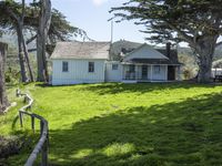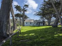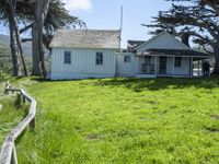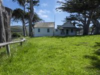 A picturesque rural farmhouse surrounded by lush green grass and trees in the California countryside.