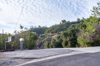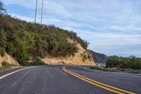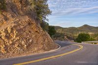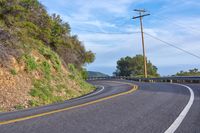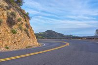 A winding S-curve road with a rock wall, elevated in the California landscape. The sun is shining on the asphalt, low mountain, cloud and contrails in the daybreak sky.