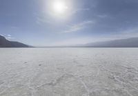 A stunning view of the California desert landscape in Death Valley, USA. The vast open space, surrounded by mountains, showcases the dramatic and emotional beauty of the salt surface and dry atmosphere. A popular tourist attraction, this plain offers a serene and sunny environment with a calm sea and lake in the horizon. The winter sky is filled with beautiful clouds, illuminating the water resources and highland hills. The mountain landforms and fell create a geologically rich and coastal scenery, making it a perfect destination for nature lovers and tourists seeking an unforgettable experience.