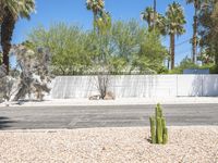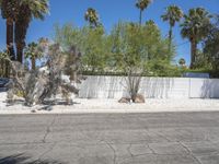 A mid-century modern estate in a lush Palm Springs neighborhood in the Sonora Desert of California, USA, with a driveway, curb, asphalt road, tile wall, brick wall, and vegetation.
