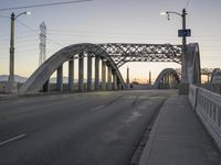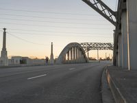 A view of the Los Angeles skyline in California, USA at dawn, featuring a cable-stayed bridge, a concrete bridge, skyscrapers, a tree-lined urban highway, and a residential area. The cityscape displays the city's infrastructure and mode of transport, showing the iron structure, asphalt road surface, overhead power lines, street lights, and a sun-soaked winter sky.