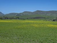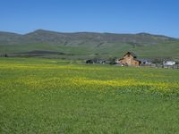 A scenic view of open grass fields in California, USA. The landscape is filled with green and yellow grass, surrounded by hills and mountain landforms. The clear sky adds to the beauty of the natural environment. In the distance, a farm shed and barn can be seen, showcasing the rural agricultural setting of the region.