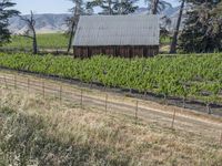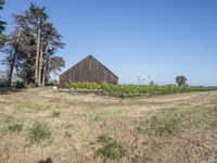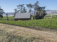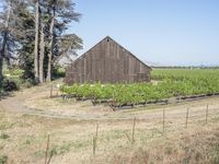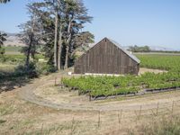 Scenic view of a rural farm and barn in California, USA on a sunny day, surrounded by green grass, dirt road, and tall trees. The elevated landscape showcases the agricultural vegetation and plantation, with clear sky and low-profile architecture. Perfect for real estate and property concepts.