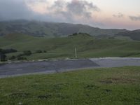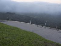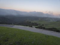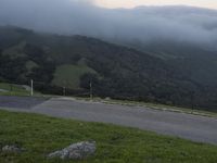 A breathtaking view of the highlands in California, USA, as the first light of dawn breaks over the mountain range. The lush green slopes, covered in fog, create a sense of wilderness and tranquility. In the distance, wind turbines can be seen spinning gracefully in the wind.