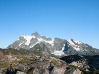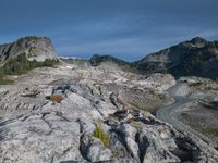Scenic view of a mountain range in California, USA, with rocky cliffs and outcrops, surrounded by wilderness and a clear sky.