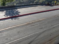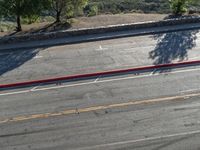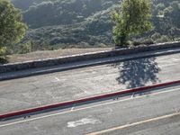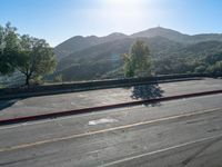 A scenic view of an Armco barrier lined road in California, USA. The elevated overview offers a recreational glimpse of the open space, mountain range and clear sky illuminated by the sun.
