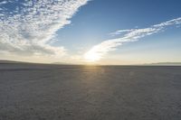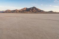 A scenic view of a road winding through the sandy desert of California, USA. The open space and majestic mountain range create a picturesque landscape, perfect for off-road adventures and recreational activities in the wilderness. The calm sea and clear blue sky on the horizon add to the serenity of this natural environment.