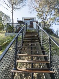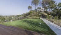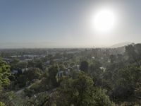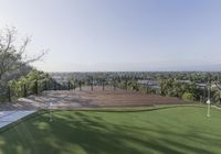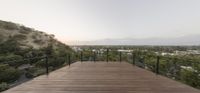 The sun rises over the city of Los Angeles, California, USA, revealing a stunning landscape of grass, trees, and mountains. The metropolitan area is surrounded by nature, with a golf course, state park, and other recreational areas overlooked from the wooden terrace of a modern villa.