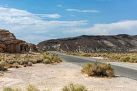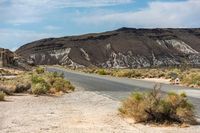 A view of the sunrise over the horizon of California, USA, featuring an asphalt road, tar, dirt, gravel, grass, trees, and the natural environment of the desert, highlands, and mountains in the background.