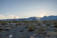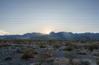 Dawn breaks over the rugged desert landscape of California, USA, with mountains, grassy plains, and a clear sky.