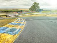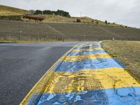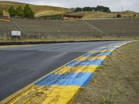 A beautiful rural landscape in California, USA, complete with asphalt road, grass, trees, and yellow wildflowers. This is the perfect place to find adventure, whether it's racing down the straight road or exploring the natural beauty of the area.